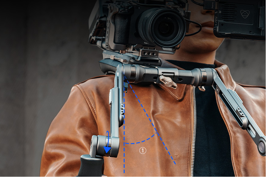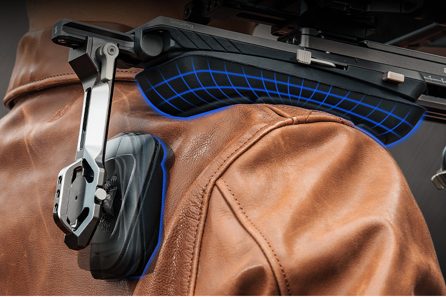 El respaldo puede girar hasta 90° y ajustarse vertical y longitudinalmente para garantizar una sujeción cómoda durante largas sesiones de grabación. En comparación con los soportes de hombro universales anteriores, su mayor estabilidad y mejor distribución del peso reducen la tensión.Las suaves hombreras y almohadillas para la espalda se sujetan mediante tiras de velcro, lo que facilita su ajuste.