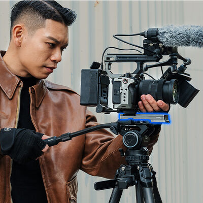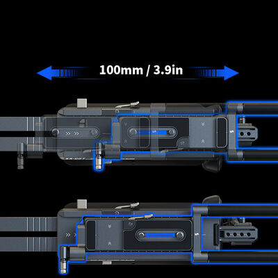 La cámara se monta mediante una placa de liberación rápida tipo Arca/Manfrotto. Su estructura multifuncional permite cambiar rápidamente entre los modos de cámara en mano, al hombro y con trípode.La placa de liberación rápida puede deslizarse hacia adelante y hacia atrás hasta 3,9″ para lograr el equilibrio perfecto.